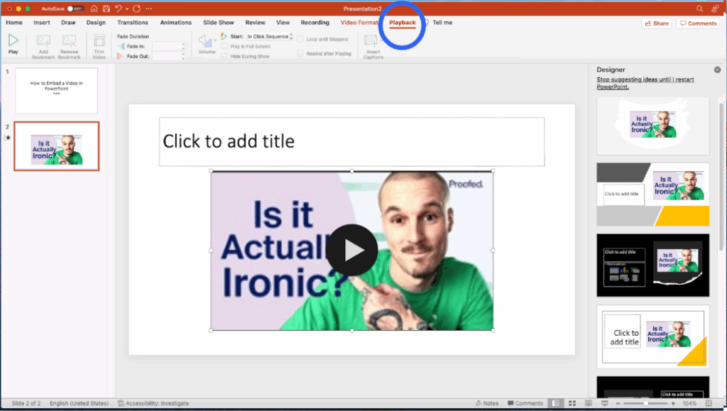 The Playback tab offers options to control how and when the video plays during your presentation.
