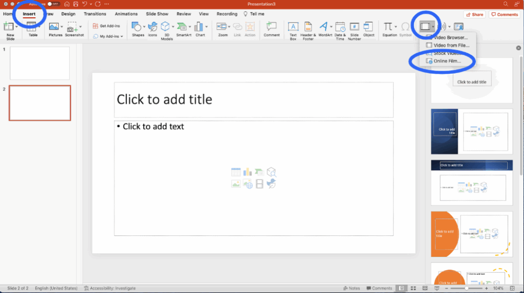 On the Insert tab, click the arrow next to Video, and select Online Film.