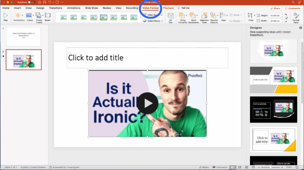Whether you inserted or embedded your video into your presentation, you can use the Video Format tab to adjust how your video appears. You can add text and play around with how the video appears on screen.